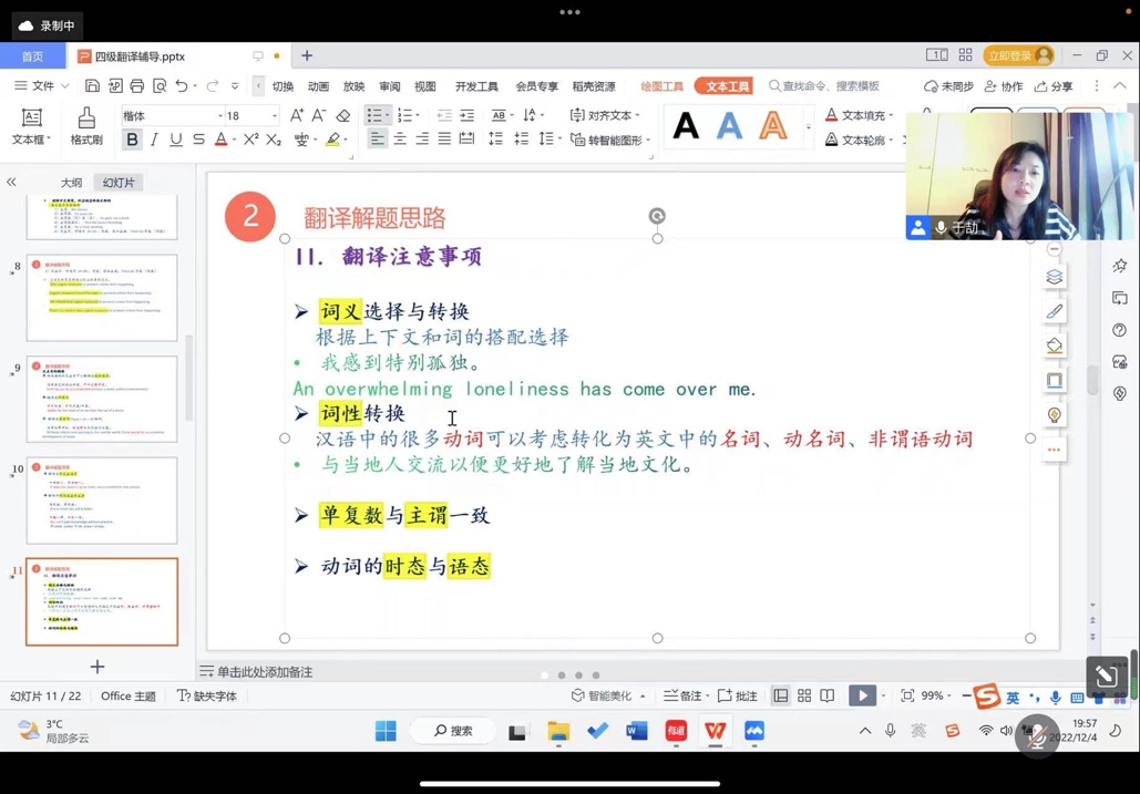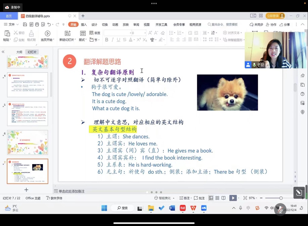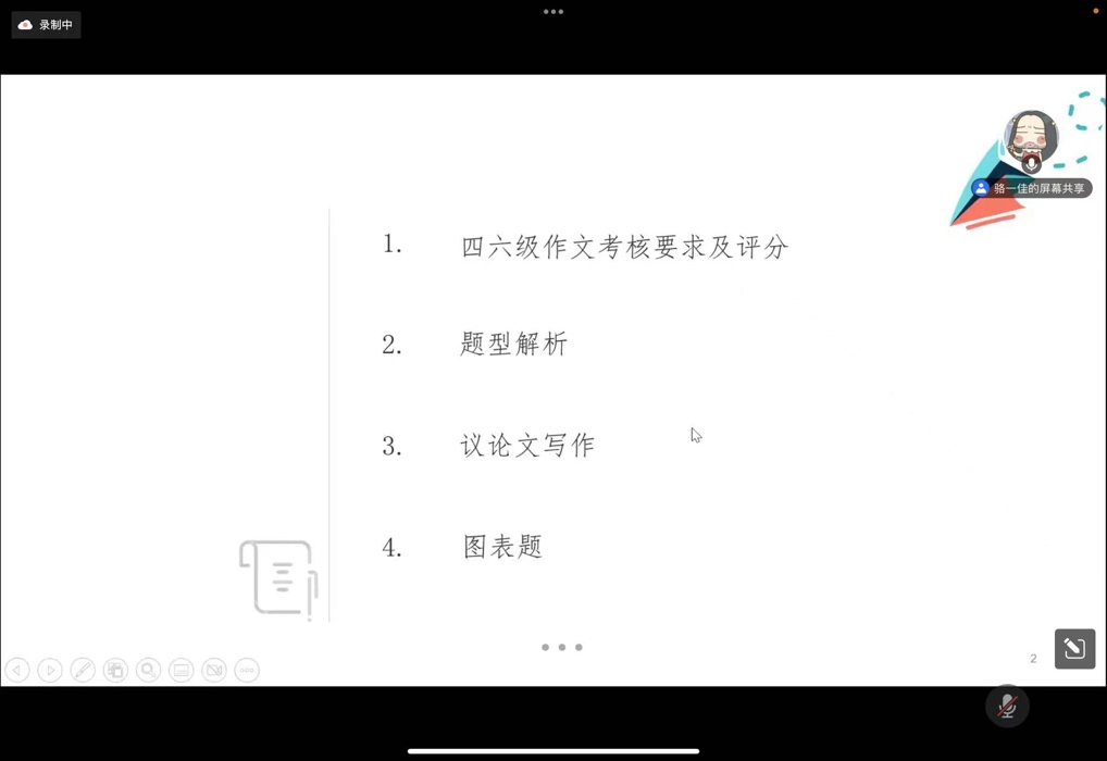 2022年12月4日晚,太阳集团tyc4633举办大学英语四六级辅导沙龙二(翻译写作篇)。本期沙龙由王娟老师主持。沙龙开始,于劼老师与学生一起分享四六级翻译的解题思路;然后,骆一佳老师对四六级写作题型进行细致分析,并通过议论文例文写作为逐步为同学进行详解;最后两位老师为同学们进行现场答疑。