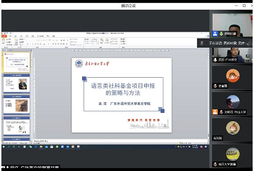 5月9日晚上,广东外语外贸大学英语语言文化学院副院长吴庄教授应邀为我院师生做了题为《语言类社科基金项目申报的策略和方法》的线上讲座,由我院外国语言学及应用语言学团队负责人时健博士主持,学院外语教师、研究生及部分本科生聆听了讲座。