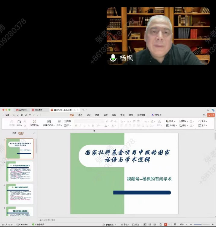 在2024年国家社会科学基金项目申报的关键时段,2月29日晚,太阳集团tyc4633邀请上海交通大学外国语学院博导杨枫教授给我院教师开展了线上讲座:《国家社科基金目申报的国家话语与学术逻辑》。本场讲座由我院副院长张辉主持,院长王新平致辞欢迎并总结发言,学院全体教授、副教授、硕士生导师、学科团队教师与研究生参加。