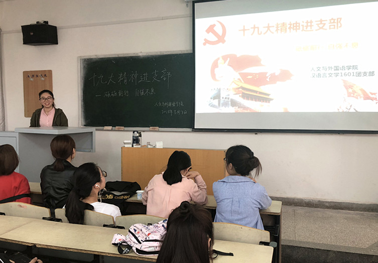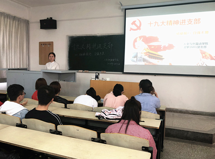 活动中,汉语言文学1601团支部李木子、法学1601团支部王红分别结合自己的专业学习和学生干部经历就近期关于学习十九大精神的切身感受及心得体悟,进行了宣讲。现场参会的团员青年进行了交流探讨,话题丰富、语言通俗,内容涵盖时下青年一代关心的热点问题。汉语言文学1601班的王晓敏说:“通过对习近平总书记系列重要讲话和十九大精神的学习,尤其是近日习近平总书记在北京大学师生座谈会中对我们青年提出的殷切希望,我深受鼓舞、倍感振奋,同时也深刻认识到肩负的历史使命。作为一名团员青年,我们一定要不断要求自己深入学习和践行党的十九大精神,并发挥青年的主观能动性,努力把十九大精神变成广大学生听得懂、能领会、可落实的好主题,让十九大精神深入每一个青年学子心中。”汉语言文学1601班郭娟说:“‘中华民族伟大复兴的中国梦终将在一代代青年的接力奋斗中变为现实’,习近平总书记的这句话铿锵有力,激励青年人乘风破浪、勇往直前。作为新时代青年,我们要在初心中找理想,在时代中练本领,在实践中显担当。”法学1601班团支书丁浩也有感而发:“要想真正学懂十九大,必须要将自己的专业与十九大精神相结合,作为法学专业的学生,我们要用法律知识去阐释十九大内涵,用法律人的精气神去展现十九大精神,用党的十九大精神传递着夺取新时代中国特色社会主义伟大胜利的坚定信心,凝聚起同心共筑中国梦的磅礴力量。”整个活动持续2个小时,大家慷慨发言,现场气氛热烈。