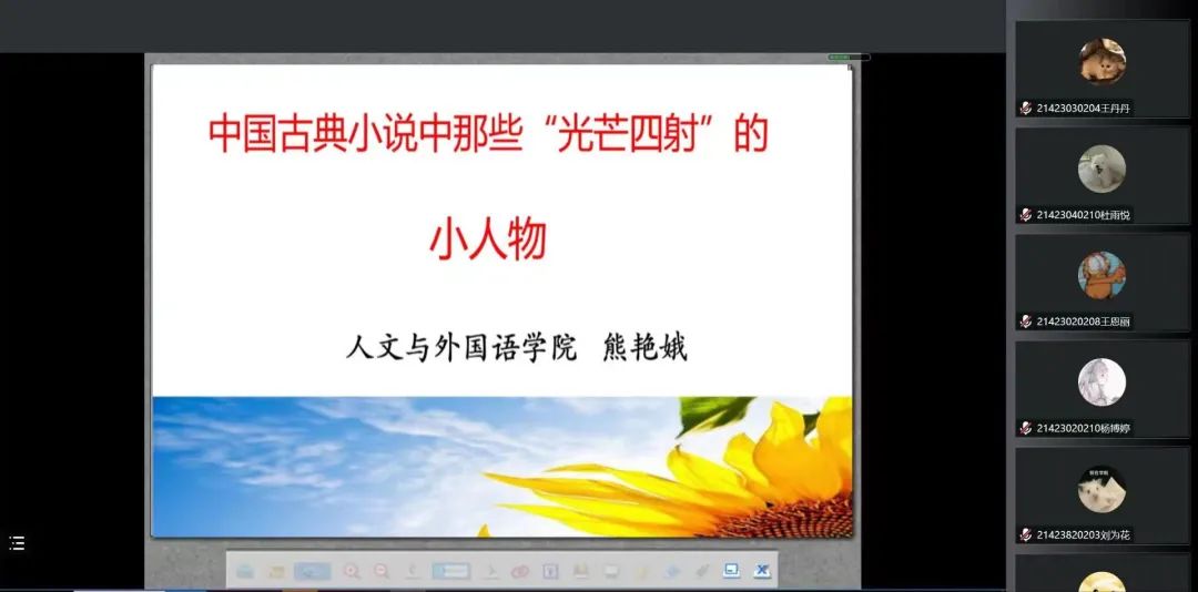 10月31日上午,太阳集团tyc4633熊艳娥副教授受邀进行第三讲。熊老师以中国古典小说中那些“光芒四射”的小人物为切入点,从中国传统文化的角度,简述古典小说中小人物的定义和价值,分析了古典小说中善良感恩,行侠仗义、扶危济困 ,为自由、尊严、爱情而抗争的“孤勇者”的人物形象,阐述小人物有价值的观点,引导学子感悟国学精粹,对阅读中国古典小说、理解人物角色有现实指导意义。