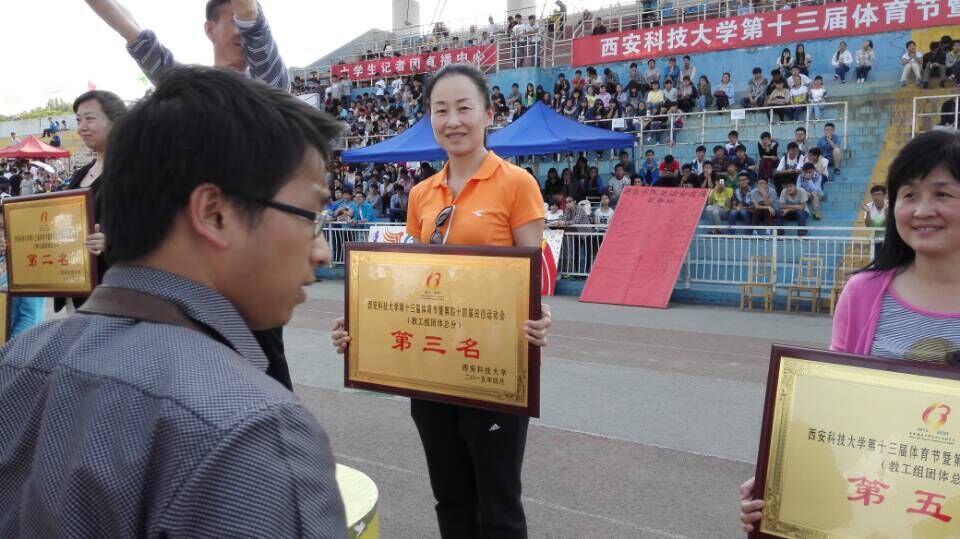 我院教师在2015学校运动会上创佳绩。其中,戴悦老师在女子甲组100米及跳高中均获得冠军;邹虹老师获得女子甲组1200米冠军及跳远亚军;李银亮老师获得男子甲组铅球冠军;和牟老师获得男子乙组铅球冠军;女子4x100米获得亚军;苏书记获得男子丙组1500米亚军;魏羽老师获得女子丙组1200米亚军;金英老师在女子乙组跳高获第5;于凡老师在女子甲组铅球获第5;刘淑励老师在女子丙组1200米位列第6;刘晓军老师在男子乙组铅球位列第6;男子4x100米获第7;吕荣华老师女子甲组铅球第7;席婉儿老师在女子乙组跳高获第8;杜安老师男子甲组1500米获第8。还有乔辉、高战辉、熊艳娥、王莉敏、邓晓菲各位老师积极参与比赛。集体项目女子4x100米的选手为:于凡、邹虹、史凤玉、戴悦;男子4x100米的选手为张立进、赵斌、杜安、李银亮;袋鼠跳选手为邹虹、于凡、史凤玉、张立进、张芸、李银亮、杜安、赵斌。