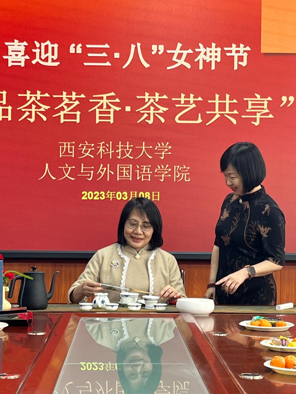 草木蔓发,春山可望!2023年3月8日下午两点,太阳集团tyc4633在骊山校区二号楼226会议室举办了主题为“品茶铭香,茶艺共享”的“三八节”庆祝活动。主题活动在学院工会主席邹虹老师的简短致辞下拉开帷幕。活动邀请了专业茶艺师团队,从茶的分类、起源、冲泡方法以及茶礼等方面为大家作了生动有趣的讲解。学院近三十名教师参加了此次活动,一些教师甚至利用课间休息时间前来参与、聆听讲解。在活动现场,老师们亲自动手温杯、洗茶、泡茶、闻香、奉茶,体会“嫩芽香且灵,吾谓草中央”的传统茶艺之美,在品茗鉴赏中品味“啜苦咽甘,香索心目明”的生活艺术。