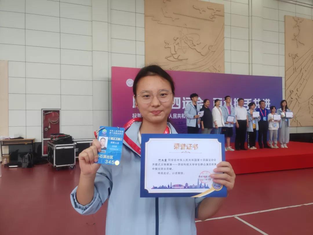 编者按:中华人民共和国第十四届运动会落幕了,赛场上有着许多激动人心的时刻,苏炳添再次创造全运会新纪录,马龙惜败于广东选手樊振东……全运风云一场更比一场激烈。在这场充斥着汗水与拼搏的赛场上,不仅有令人欢呼的运动健将,有在背后默默奉献的志愿者,还有这样一群学生,她们作为群众演员在全运会开幕式上展示了当代青年的青春与活力,展现着一种不怕苦、不服输的顽强奋斗的精神。来自西安科技大学人文与国语学院法学2001班的何雨露便是其中一位。