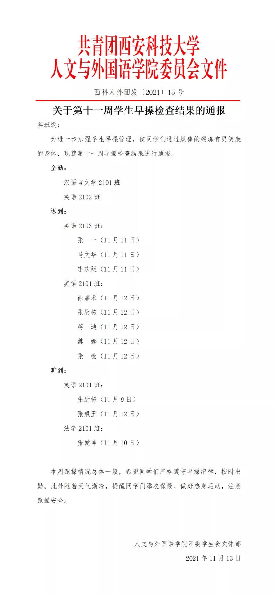 为提高学生的健身锻炼意识和健康水平,学院相关部门进行督导,现将情况通报如下: