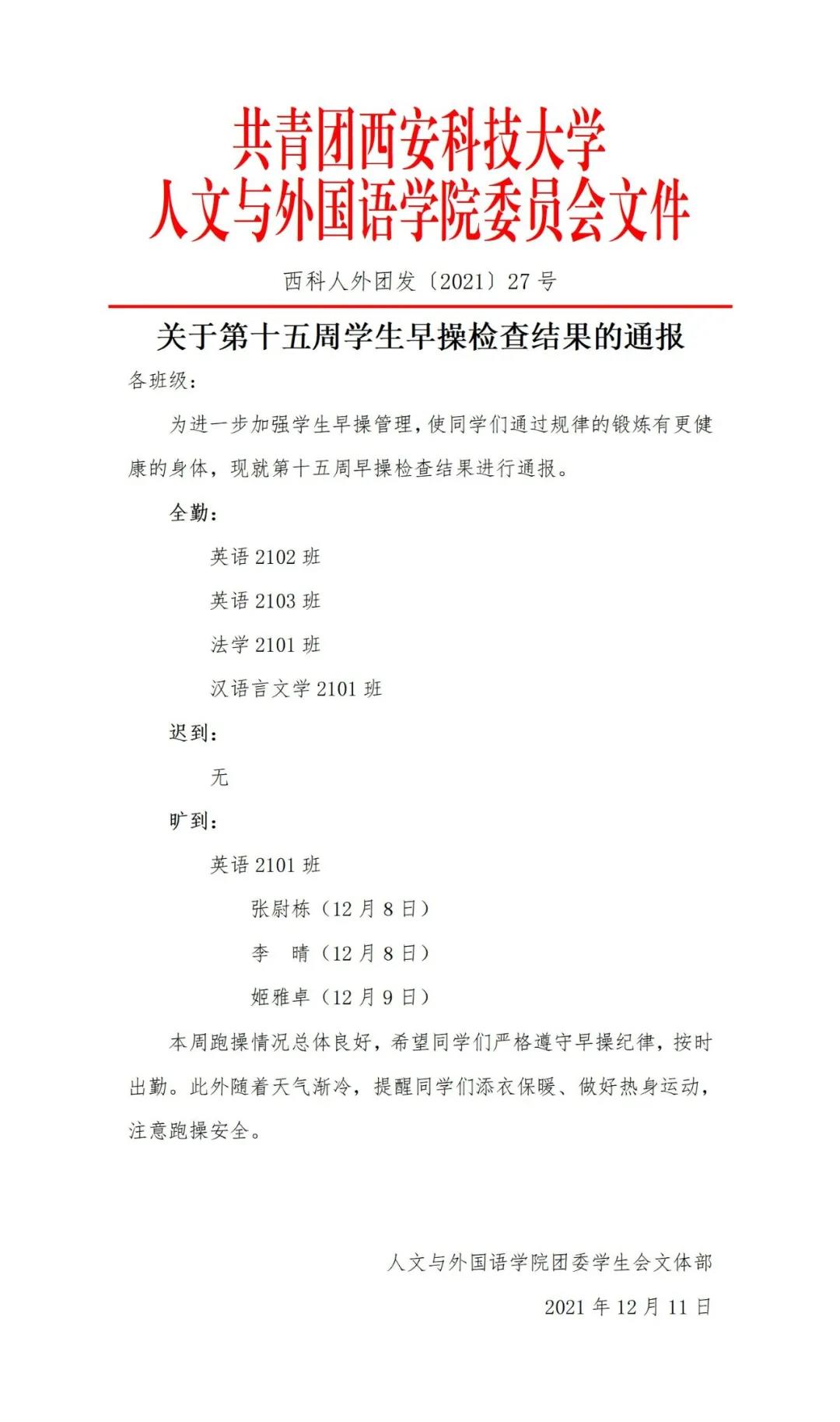 为提高学生的健身锻炼意识和健康水平,学院相关部门进行督导,现将情况通报如下: