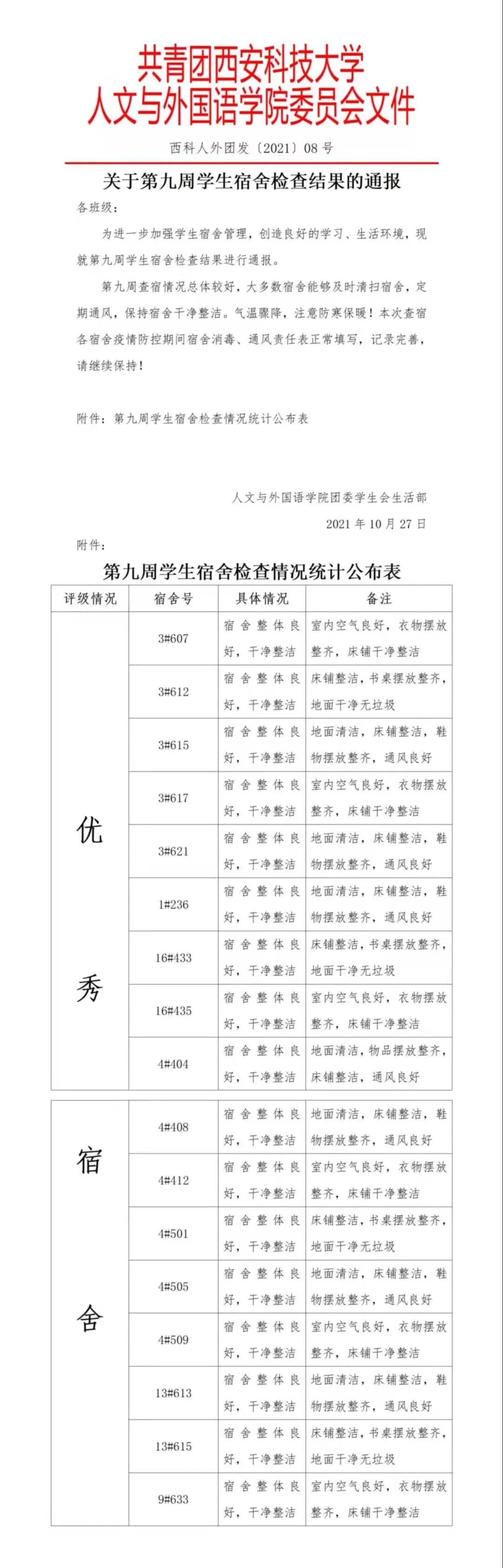 充实的校园生活当然离不开宿舍卫生这一环,通过卫生检查为契机,齐心协力把宿舍卫生环境工作提高到一个新水平,使宿舍达到“亮、净、美”的效果,确保学生在学校健健康康生活而奠定坚实的基础。本次宿舍卫生检查汇总如下: