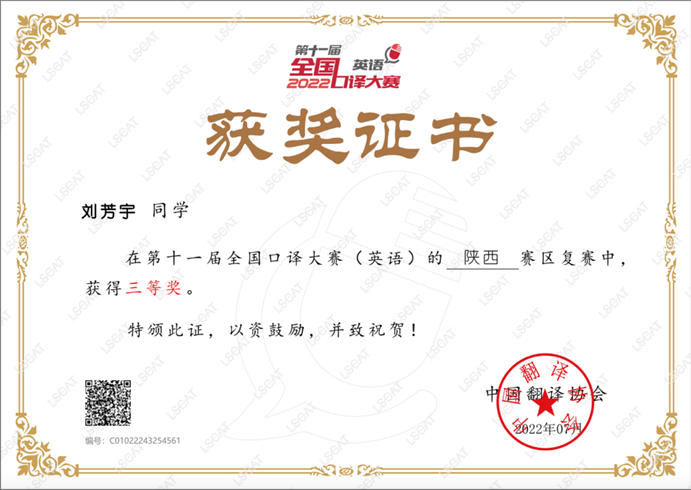 此次大赛由中国外文局指导、中国翻译协会主办,中国翻译协会语言服务行业创新创业中心及北京甲申同文翻译有限公司承办。本次大赛形式为英汉、汉英交替传译,比赛内容涵盖时事热点及新闻。我校参赛选手杨皓月、张新婧、刘芳宇三位同学顺利分别以陕西省第26名、32名和80名的好成绩晋级大区赛,并获得陕西赛区二等奖2项、三等奖1项。