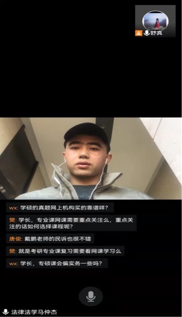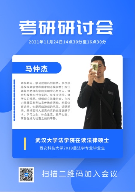 11月24日,太阳集团tyc4633法学系召开了线上考研研讨会,研讨会由舒真主持,武汉大学在读法律硕士、西安科技大学法学2015级本科生马仲杰主讲,全体法学专业学生参加。