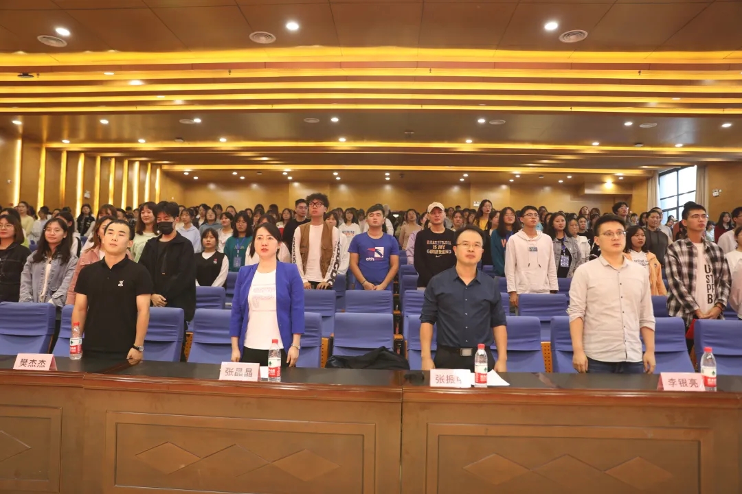 会议伊始,与会全体人员起立 ,合唱国歌,为表彰大会拉开了序幕。团委书记张晶晶宣读了团委学生会干部调整决定。