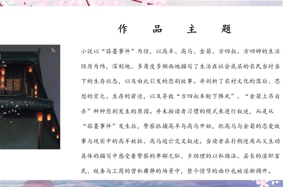 第四组分享的作品是《天堂蒜薹之歌》,小组代表方文慧解读了故事发生的时代背景和导致小说中种种悲剧发生的原因。