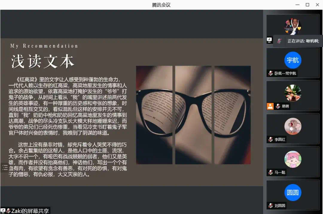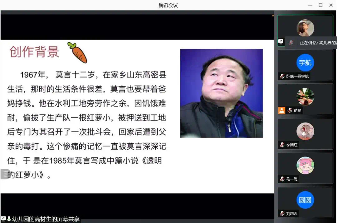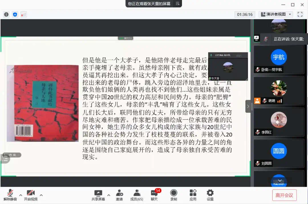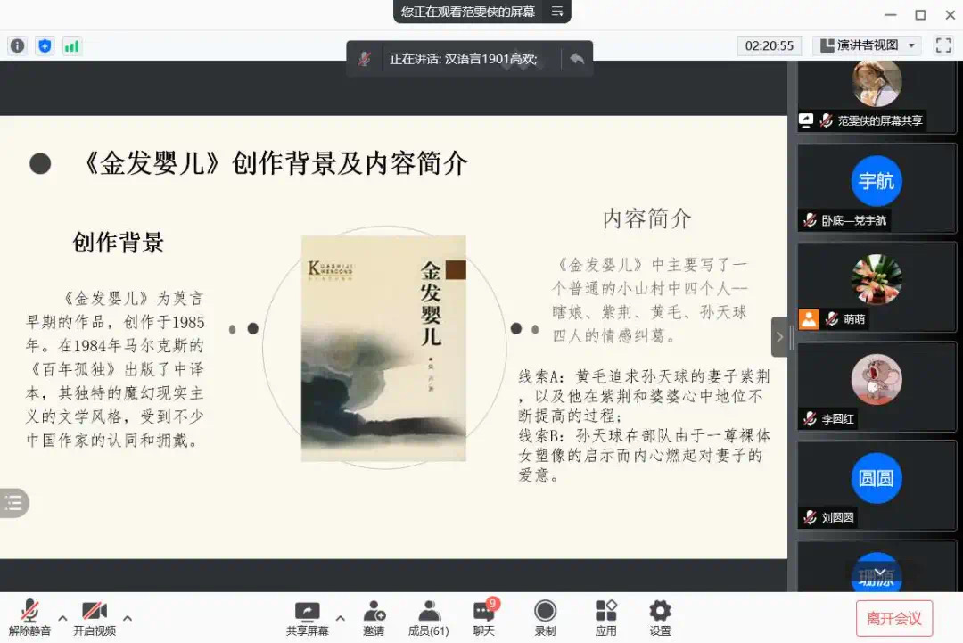 为了使大家多读书,好读书,读好书,并且“熟读而精思”,2021年10月11日,太阳集团tyc4633汉语言文学专业举办了以“莫言的小说”为主题的线上读书交流会。指导老师郭萌及汉语言文学专业19级全体同学参加活动。