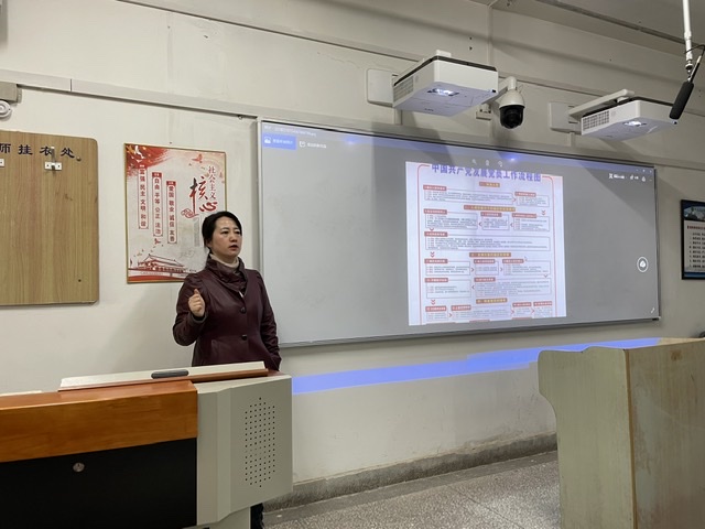 张晶晶以“共产党的光辉历程”为题,首先从中国共产党领导国人由救国走向兴国,富国,强国的过程,向学员们阐述了我党筚路蓝缕、不屈不挠的前进精神。并以同学们成长过程中的社会变迁为切入点,讲解了近年来我国国民生活的变化与我国制度建设方面的联系,行程万里,初心如一,她要求在座学生深切体会中国特色社会主义、和平发展的来之不易,发扬“吃苦在前,享乐在后”的精神,鼓励学员们要敢于追梦,敢于迎难而上,为中国梦的实现贡献自己的力量。