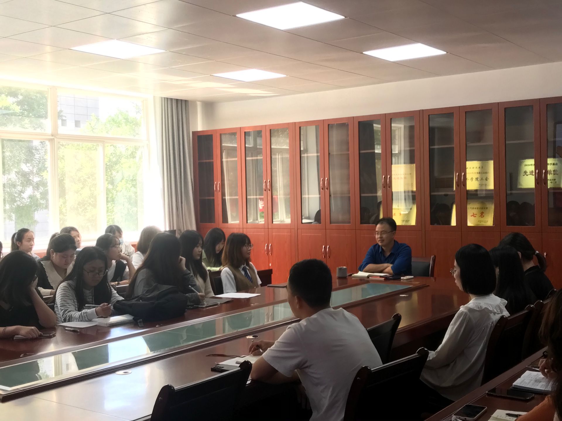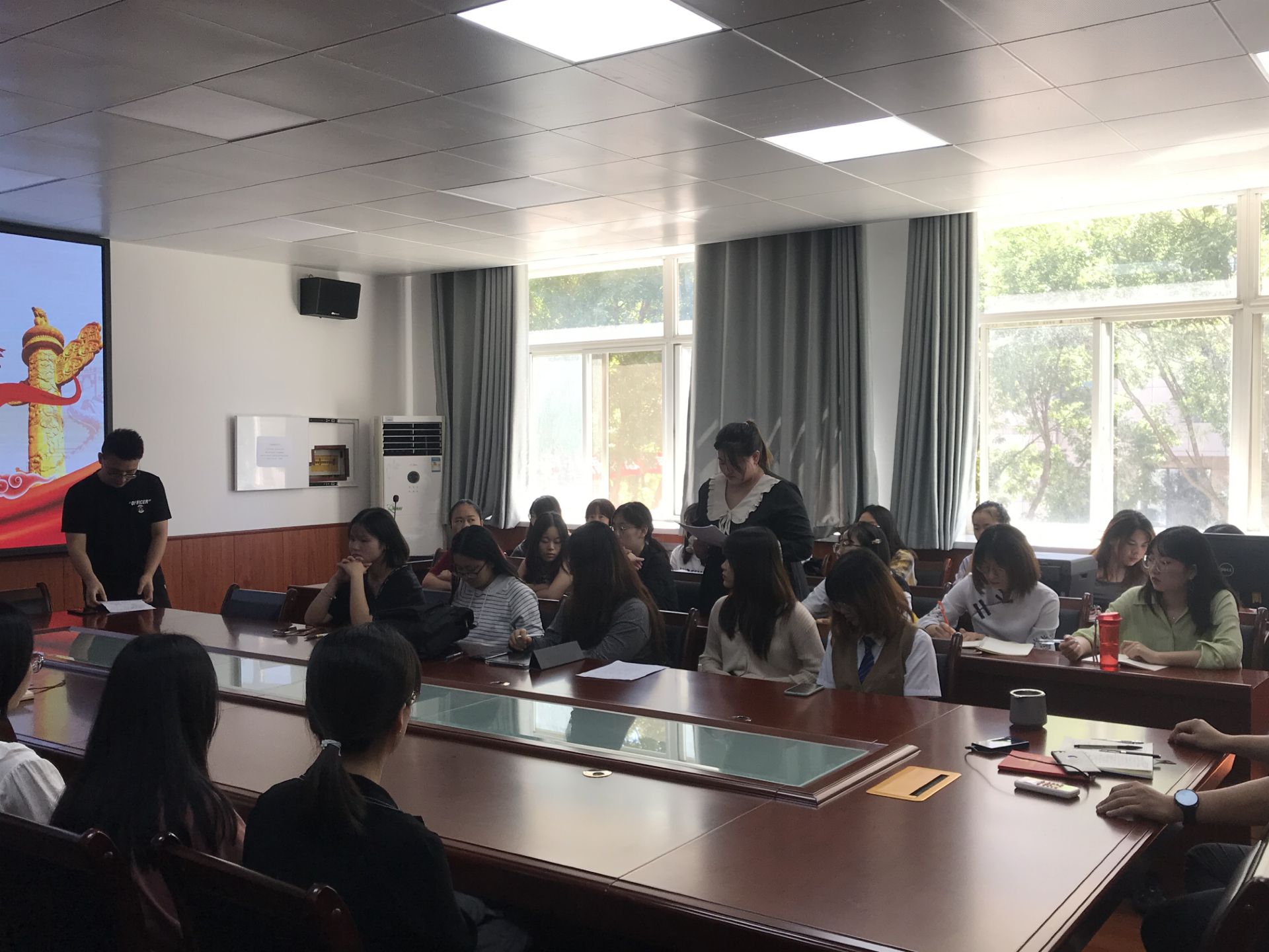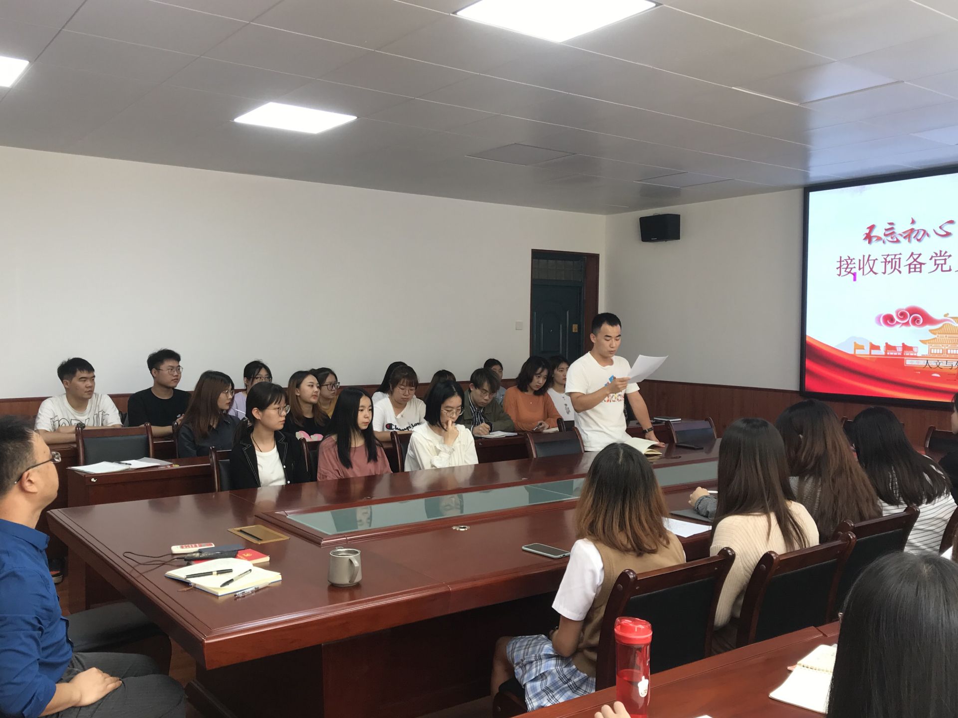 随后高琬莹、李双珍两位同志分别向党组织汇报她们在预备期间的表现、情况,之后入党介绍人提出同意高琬莹、李双珍同志转正。接着樊杰杰同志传达党组织意见,同意两位同志成为一名正式党员。之后其他各位同志依次发言,谈了两位同志在学习、生活等多各个方面的情况。