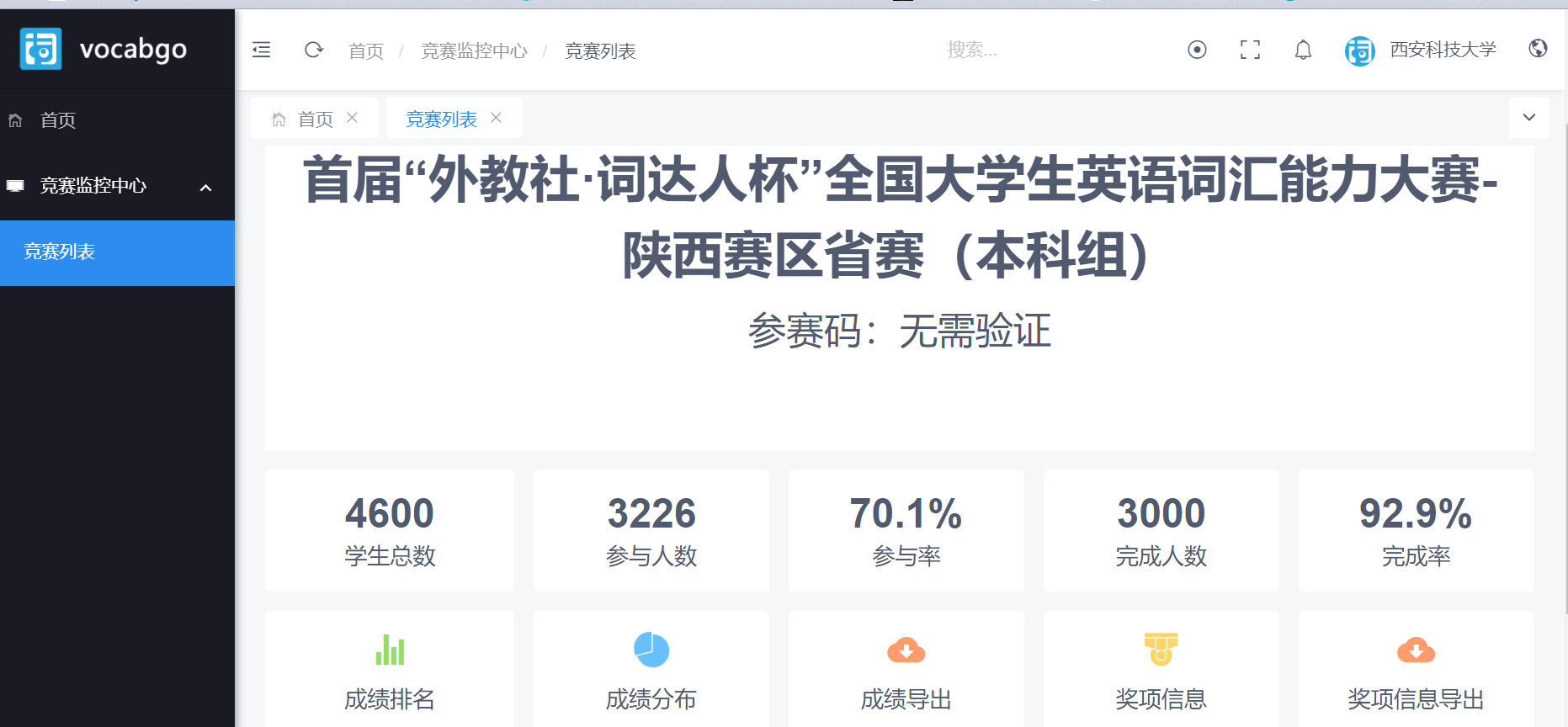 此前,我校已经完成了线上模拟赛,校园选拔赛以及陕西赛区复赛的线上赛组织工作。初赛阶段,我校共有3500名学生参加,经过激烈竞争,有200名学生进入陕西赛区复赛。复赛阶段我校共有91名选手进入首届“外教社·词达人杯”全国大学生英语词汇能力大赛全国总决赛。