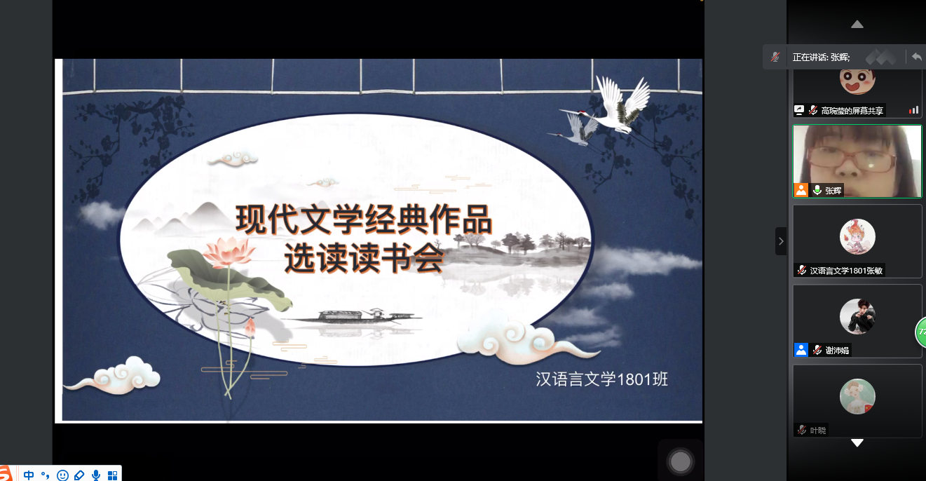 2021年4月8日晚7点,太阳集团tyc4633汉语言文学1801班在系主任张辉的组织下举办了主题为“现代文学经典作品选读”的线上(腾讯会议)读书会,张辉、高婉莹分别任此次读书会的点评嘉宾和主持人,参会人员由汉语言文学1801班全体学生及全校热爱品鉴文学作品的学生组成。读书会以小组选派代表演讲的方式进行所选作品的解读和鉴赏。
