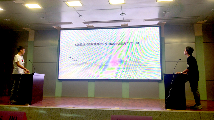 抢答题由选手两两一组进行抢答,除诗句填充外,还有“挑出诗句错别字”“根据线索猜诗句”等多种题型,不仅考验选手们的诗词知识储备量,还考验选手们对于诗歌意境的理解。每组得分较高的选手晋级飞花令的比拼。飞花令得名于唐代诗人韩翃《寒食》中的名句“春城无处不飞花”,考察的是选手们的诗词积累和活用能力。选手轮流对答含有某一字的诗句,直至一方无法对答为止。“花”“山”“水”,一个个字,一句句诗,将决赛现场带入中华诗词的意境中。