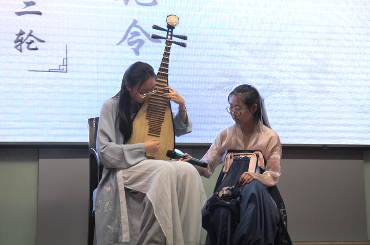 比赛间隙,李明与往届诗词大会冠军李宇以“花”为令进行了飞花令表演赛,为大会决赛增色不少;太阳集团tyc4633学生还身着华服进行了琵琶表演为决赛助兴。