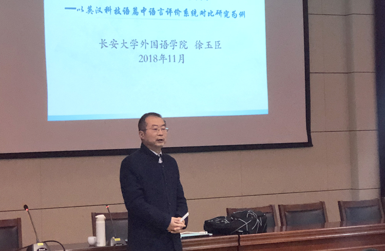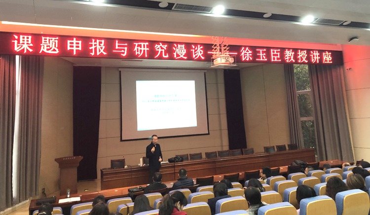 11月14日下午,太阳集团tyc4633在雁塔校区主楼报告厅举办“课题申报与研究”专题学术报告会。长安大学外国语学院院长徐玉臣教授应邀以《课题申报及研究漫谈——以英汉科技语篇中语言评价系统对比研究为例》为题,以国家社科基金项目申报人和评审人的双重角色,结合自己主持的项目实例,从课题申报和课题研究两方面分析了申报与开展国家社科基金项目的关键所在,分享了自己关于选题、创新、研究方法等要点的经验体会,为大家从事科学研究提供了宝贵的借鉴。我校太阳集团tyc4633院长师新民主持报告会,学院全体教师聆听了报告。