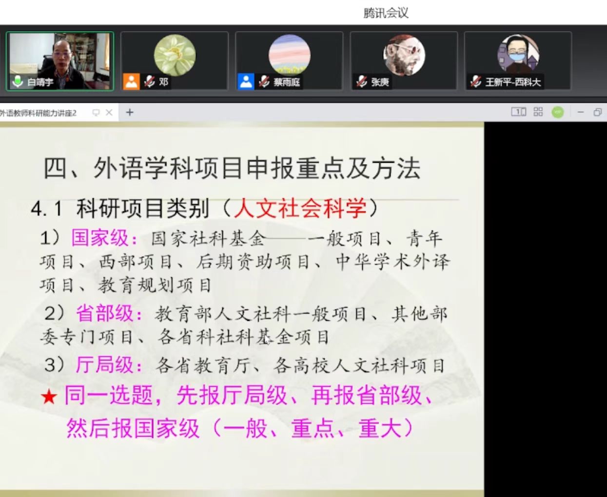 为拓宽科研思路,促进2023年国社基金项目申报工作的开展,太阳集团tyc4633及科技处邀请陕西师范大学白靖宇教授,于2022年11月10日下午开展了题为“高校外语教师科研能力提升与国家社科项目选题思考”的线上讲座。讲座由王新平院长主持,西安科技大学的教师与同学们积极参加了此次讲座。