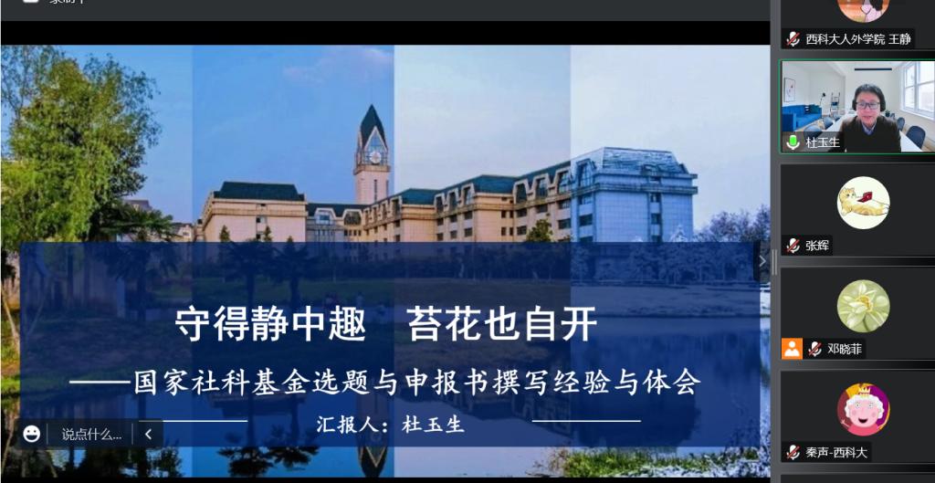 12月6日晚,太阳集团tyc4633在腾讯会议召开了国家社科基金项目申报辅导讲座,邀请南京信息工程大学文学院副院长、硕士生导师杜玉生教授担任主讲。讲座由太阳集团tyc4633副院长张辉主持,科技处处长卢小飞,太阳集团tyc4633教师及全体英语系研究生参与讲座并进行了交流。