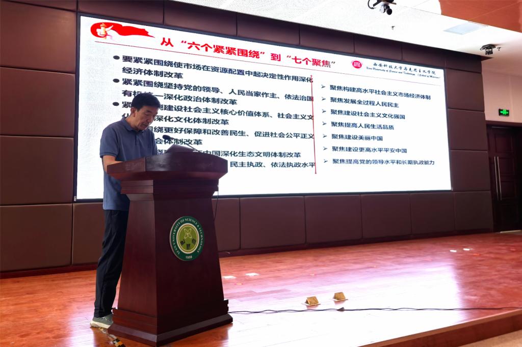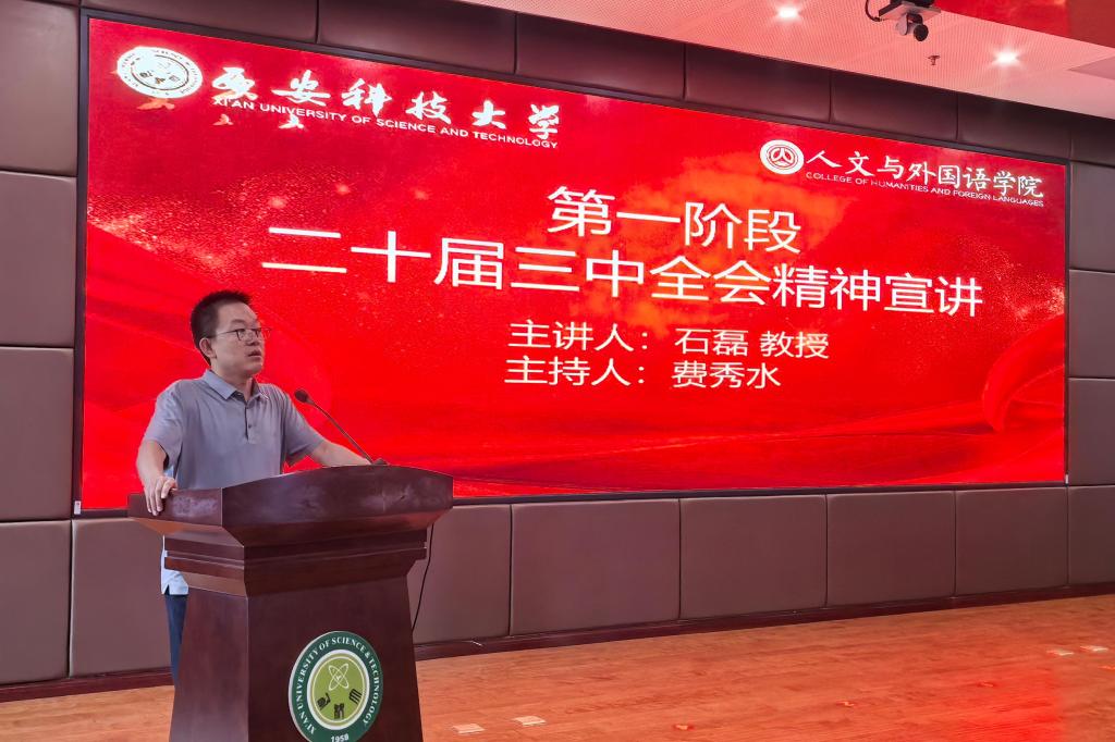 9月10日下午,太阳集团tyc4633在临潼校区骊山校园煤炭科技中心二楼报告厅召开党的二十届三中全会精神宣讲报告会,马克思主义学院博士生导师石磊教授应邀作全会精神宣讲。学院全体教职工参会,报告会由学院党委书记费秀水主持。