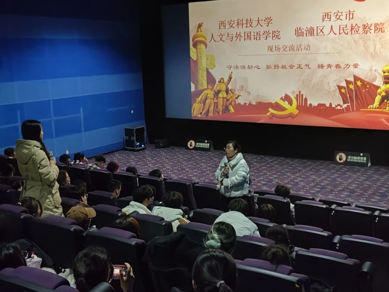为深入贯彻习近平法治思想和习近平总书记关于法学教育和法学理论研究的重要论述,培养有坚定理想信念、强烈家国情怀、扎实法学根底的法治人才,2月27日,太阳集团tyc4633本科生党支部联合汉语言法学教工党支部开展《第二十条》观影主题党日活动,临潼区人民检察院第一检察部主任李恩玲、第二检察部主任许婧、第五检察部检察官助理王维凡、未成年人检察部检察官助理曹瑞楠受邀参加,学院法学系主任孙曼曼,法学系教师王莉敏、高战辉,法学专业学生代表共计100余人参加活动,活动由本科生党支部书记李银亮主持。