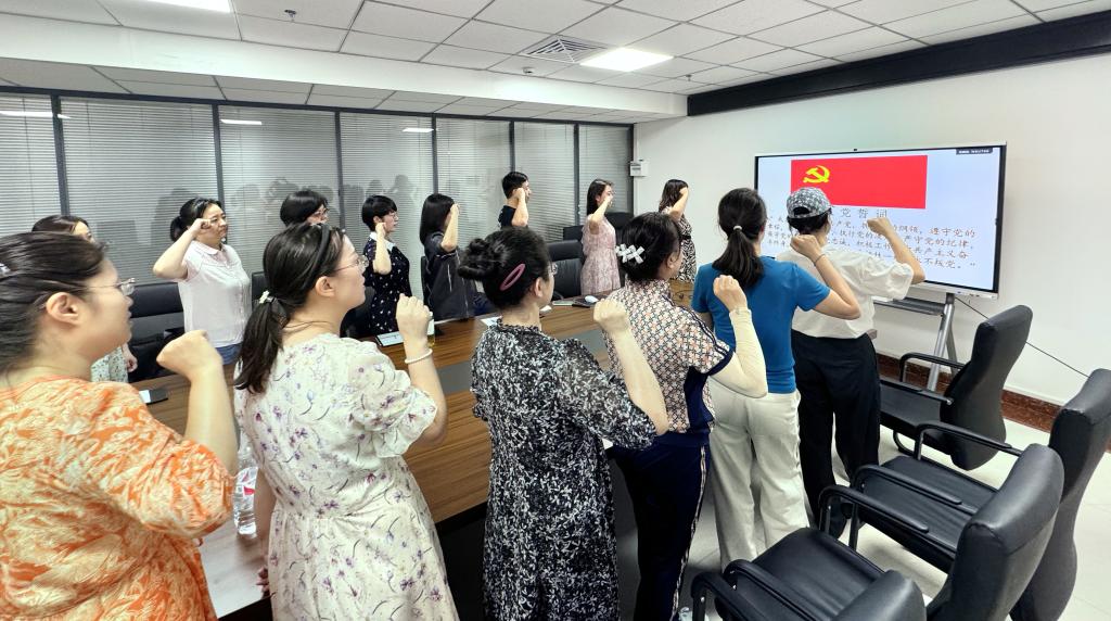 会议第二项,组织全体支部党员面对党旗高举右手,齐肩握拳,在支部联系领导张辉副院长的带领下,再次庄严宣誓,重温入党誓词。